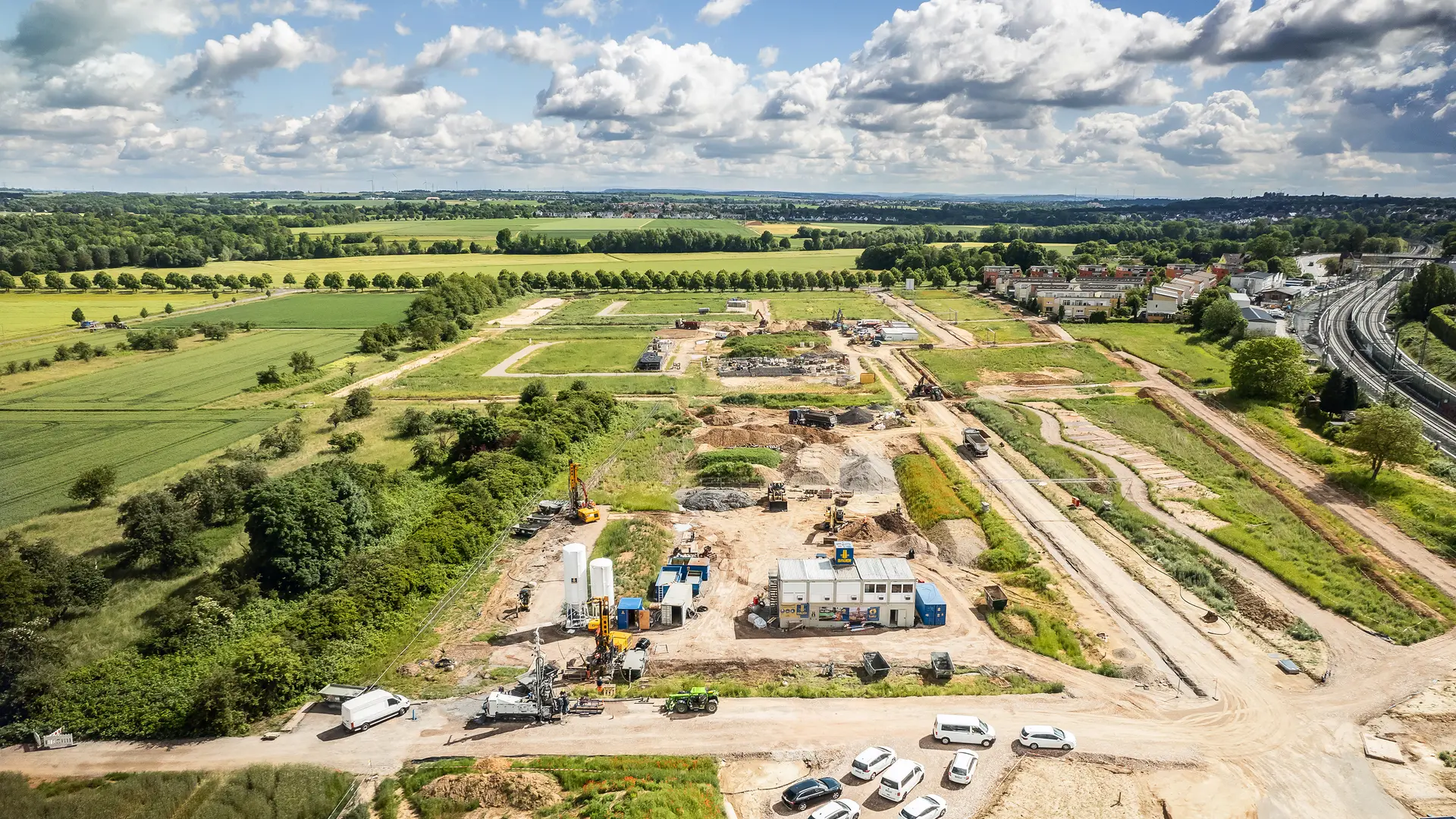 The project is unusual not only because of its magnitude and the effort involved, but also because of the particular soil: The surface level of the 17.7 ha site is covered with glacial loess loam. This is one of the most valuable soil types in the world. “For this reason, protecting the soil was a top priority. None of the construction vehicles were allowed to drive directly over the grounds. Instead, extra access roads were built and the soil was protected with wood chips and load distribution plates,” explains Raphael Werner. The deeper stone strata also posed multiple challenges: On the one hand, the drilling equipment had to be adjusted frequently because of the varying soil strata. Furthermore, flushing losses occurred unexpectedly. “Not an easy undertaking, but ultimately no problem for us. In some cases we flushed the boreholes differently, in some areas we adapted the casings,” remarks experienced Operations Manager Marcel Mößlang of BAUER Resources GmbH.
