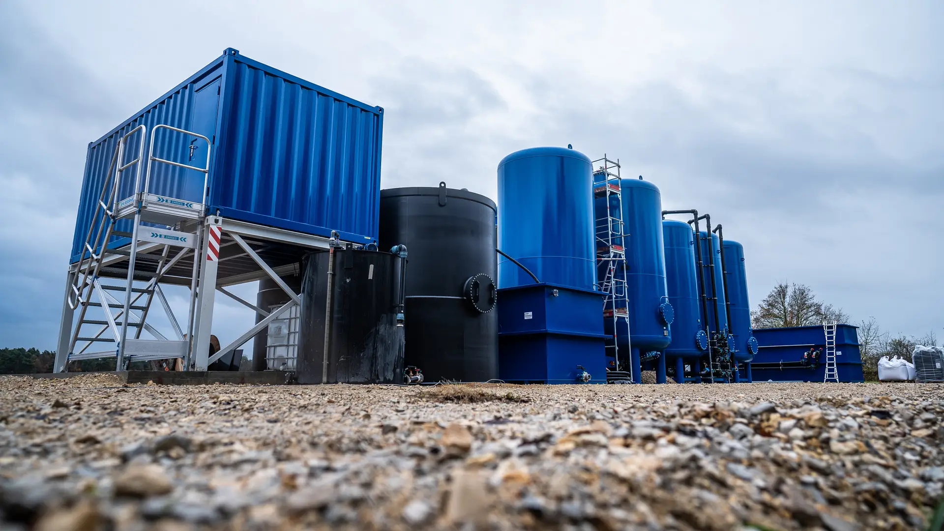 The project began in April 2024 – a technically demanding undertaking. This is because the groundwater treatment plant was customized for the client’s requirements down to the smallest detail and fabricated in the Schrobenhausen plant. “Special projects require special solutions,” emphasizes Sales Engineer Sebastian Hohlweg from the Bauer Umwelt Division of BAUER Resources GmbH, then mentions a few figures to explain the dimensions of the plant: “After all, we are talking here about a 40-foot control container, one dosing container, two gravel filters, two liquid phase activated carbon filters, five tanks or vessels and a chamber filter press.” Due to the tight schedule, the plant was completed in just 18 weeks: far from a simple task, as many components such as special pumps and filter tanks had extremely long delivery periods. “For this reason, we divided the components into time-critical and not time-critical parts during the preparatory phase to ensure a smooth working process,” continues Sebastian Hohlweg. This project is unique for the technical specialists: “I can’t remember ever building a plant this big,” proudly remarks Site Manager Harald Huebner from the Bauer Umwelt Division of BAUER Resources GmbH. With an impressive cleaning capacity of 150 m³/h, it is one of the largest plants of its kind in Germany.