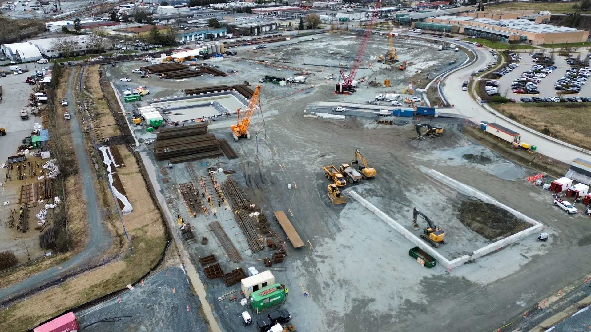 Our experts at Bauer Foundations Canada were contracted to design and construct an excavation pit and foundations for a new nine storey hospital with two levels of underground parking in Surrey British Columbia. The details: Using BAUER’s MC 96 duty cycle cranes with a cable grab and BC 48 trench cutter, 435 linear metres of polymer supported diaphragm wall was installed up to 23 m in depth along with 256 foundation barrettes to a depth of 27.5 m. Team effort: With excellent planning and collaboration, we poured concrete elements for 130 days straight to reach an overall total of 30,000 m3 of concrete and 7,000 tons of steel.