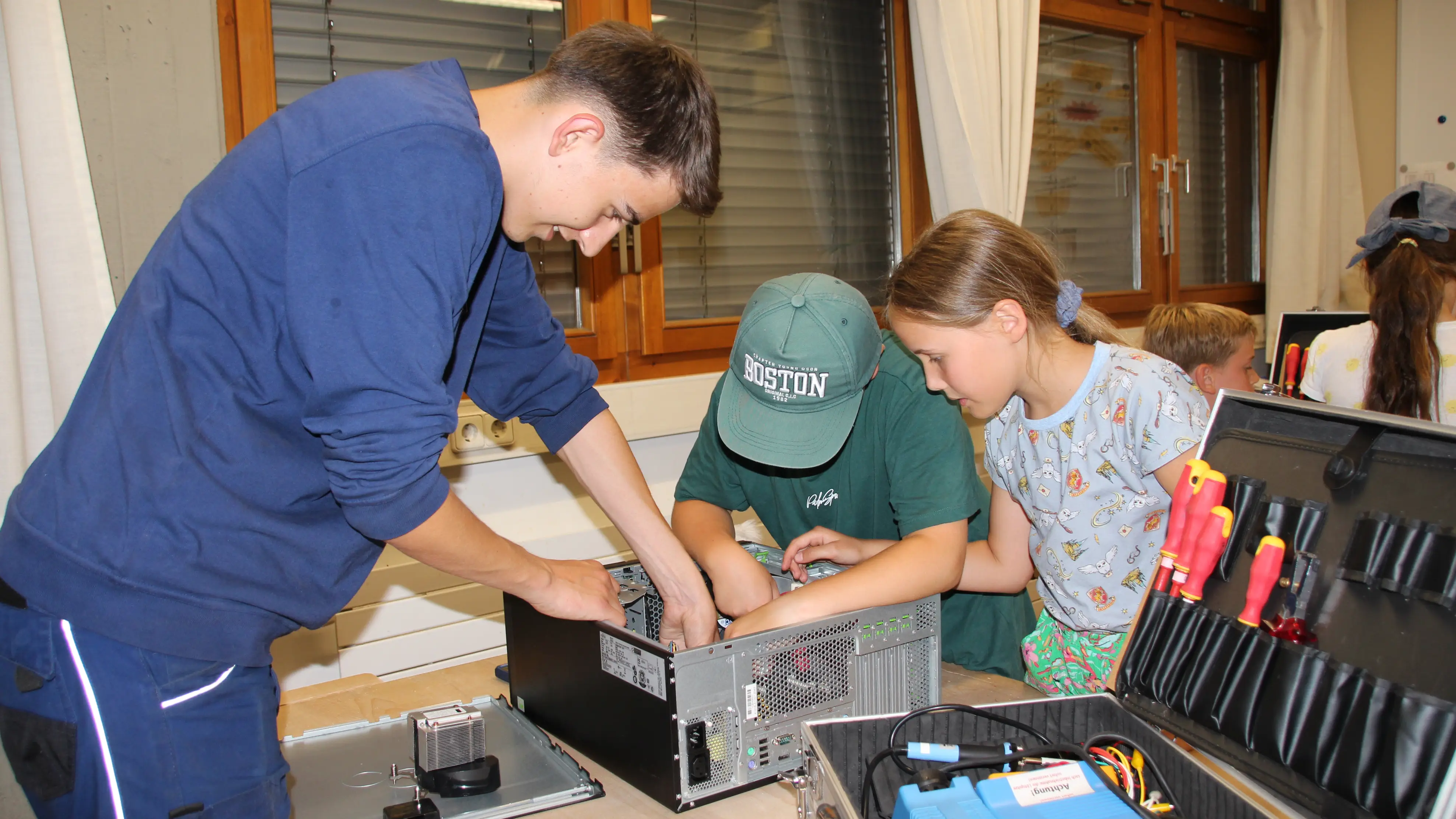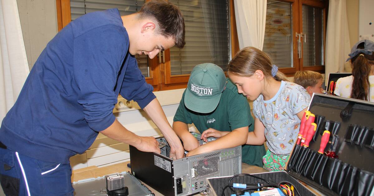 Jede Woche erhielten die Kinder eine neue Aufgabe. Beispielsweise löteten sie unter fachkundiger Anleitung der Lehrlinge eine Platine, die am Ende wie eine Sirene aufheulte. Am letzten Kursnachmittag wurde es nochmal richtig spannend: In Gruppen aufgeteilt durften sie ausrangierte Computer auseinandernehmen und analysieren.